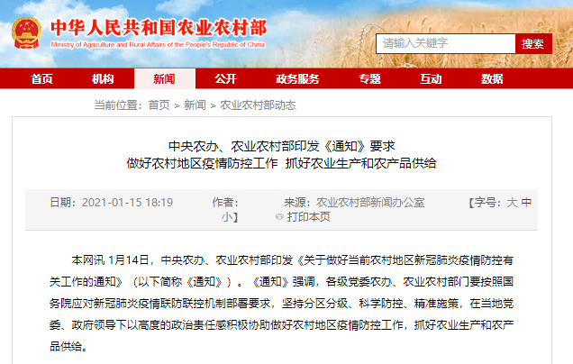 1月14日,中央农办、农业农村部印发《关于做好当前农村地区新冠肺炎疫情防控有关工作的通知》(以下简称《通知》)。《通知》强调,各级党委农办、农业农村部门要按照国务院应对新冠肺炎疫情联防联控机制部署要求,坚持分区分级、科学防控、精准施策,在当地党委、政府领导下以高度的政治责任感积极协助做好农村地区疫情防控工作,抓好农业生产和农产品供给。
