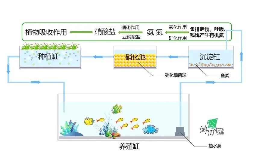 一般而言,鱼菜共生系统由水产养殖、植物生产两部分子系统组合而成。在水产养殖子系统中,投喂后未被摄食的饵料、鱼类排泄物在养殖水体中会转化成有害的氨、亚硝酸盐,而这种富氮尾水则是植物生产子系统主要的营养来源。系统中的微生物借助水循环将鱼和植物联系起来,将含氮类有害物质转化为可供植物吸收利用的硝酸盐,水体得到净化后又回到水产养殖池内,如此循环往复,周而复始。