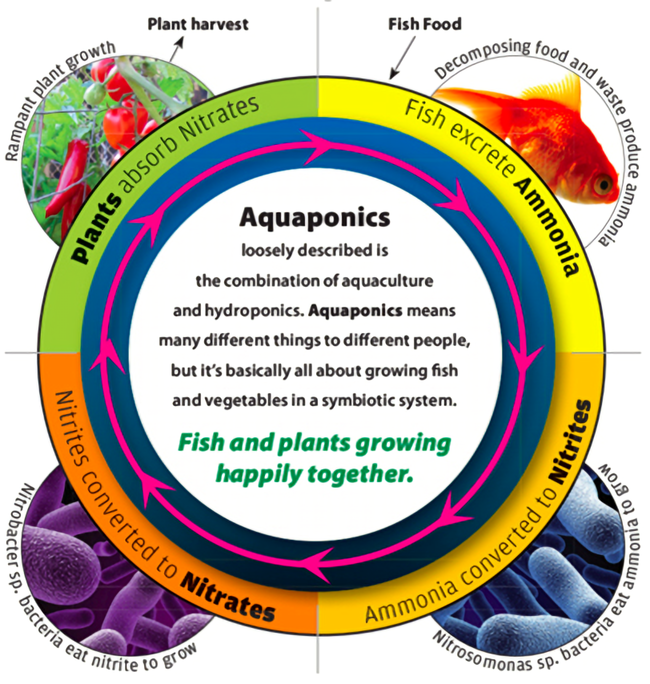 “鱼菜共生”,通过科学的生态设计,使得鱼、微生物、植物三者之间在水体循环中达到和谐共生的生态平衡,从而实现了养鱼不(少)换水而无水质忧患、种菜不施肥而茁壮成长的生态共生。