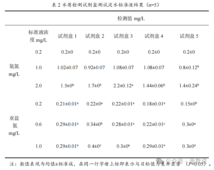 采用氨氮为0.2、1.0和2.0ppm,亚硝酸氮为0.2、1.0和1.0ppm的标准液,采用5种试剂盒开展检测。结果见下表,当标准液氨氮浓度较低(0.2 mg/L)时,试剂盒检测结果与目标值一致;但当浓度升至1 mg/L,有1种试剂盒的检测结果已显著低于目标值(P<0.05);浓度进一步提高至2 mg/L时,3种试剂盒的检测结果均显著偏低(P<0.05),显示偏差较大。在亚硝酸盐氮检测中,即便在低浓度条件下(0.2 mg/L),已有1种试剂盒的检测结果显著偏低(P<0.05);当浓度升至0.6 mg/L与1.0 mg/L时,5种试剂盒的检测结果均显著低于目标值(P<0.05),表明在此范围内存在明显的系统性负偏差。因为亚硝酸试剂盒检测量程不到0.3ppm。