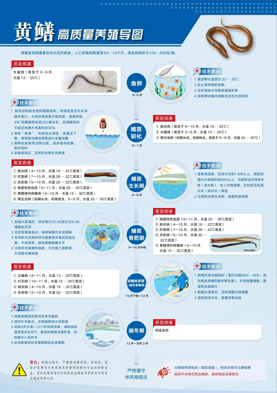 为做好水产养殖技术服务,降低养殖过程质量安全风险,促进水产养殖业高质量发展,农业农村部渔业渔政管理局组织中国水产科学研究院、全国水产技术推广总站、中国农业出版社等单位系统梳理了黄鳝、牛蛙、泥鳅、大口黑鲈、鳊鱼、鲫鱼、乌鳢等7个重点品种从苗种繁育到出塘上市全过程生产技术要点和易发病害,根据养殖生产时间轴编制了高质量养殖导图。