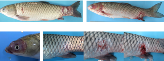 在发病晚期,吻端、眼眶周围、腹部等部位出现溃烂,甚至深层肌肉坏死,骨骼暴露,伴随水霉絮状附着或全身性出血。