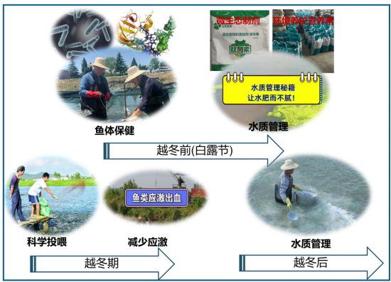 在冬季,低温、长期饥饿和水质老化是引发越冬综合征发生的重要因素,因此,这个季节的重点是通过水位和水质管理,减少低温和水质老化的影响;其次,通过合理投喂,补充鱼体能量,增强鱼体抗寒和抗应激能力。
