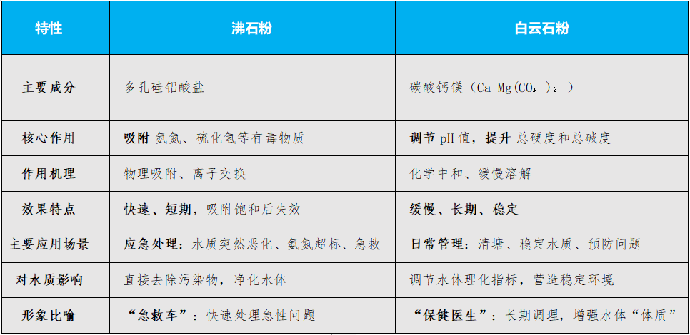 总而言之,沸石粉是解决水体“污染”问题的利器,而白云石粉是维持水体“健康”基础的基石。正确理解它们的区别,根据实际水情选择使用,是水产养殖水质管理的关键技术之一。