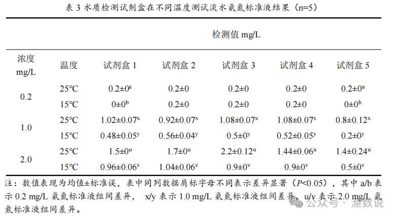 进一步数据分析表明,低温对检测准确性影响显著。在15℃时,1.0 mg/L氨氮样品的测试结果较实际值低44%–80%,2.0 mg/L样品则偏低50%–60%。相比之下,在25℃条件下测定2.0 mg/L标准液时,测试结果仅偏低约20%。以上结果说明,氨氮检测试剂盒的测试性能受养殖水体温度影响显著,低温条件下易导致检测值系统性偏低。冬天可能因为气温和水温低,反应不能正常进行,水体氨氮实际浓度可能显著高于测试浓度。