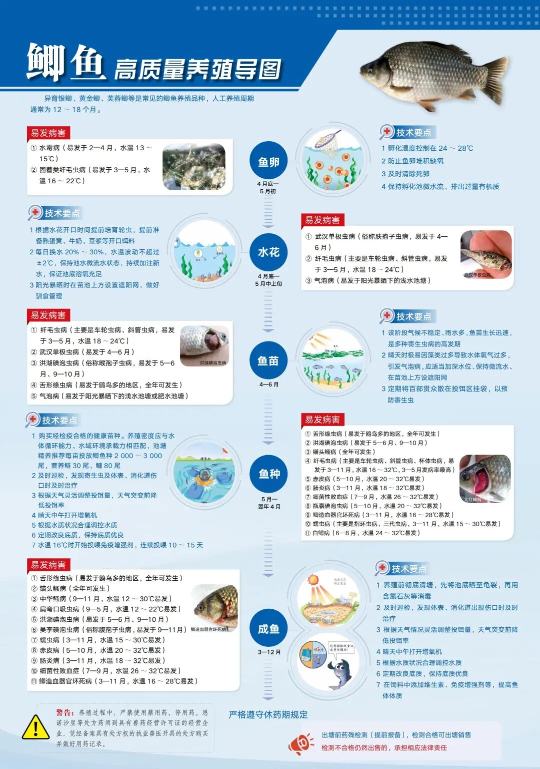 为做好水产养殖技术服务,降低养殖过程质量安全风险,促进水产养殖业高质量发展,农业农村部渔业渔政管理局组织中国水产科学研究院、全国水产技术推广总站、中国农业出版社等单位系统梳理了黄鳝、牛蛙、泥鳅、大口黑鲈、鳊鱼、鲫鱼、乌鳢等7个重点品种从苗种繁育到出塘上市全过程生产技术要点和易发病害,根据养殖生产时间轴编制了高质量养殖导图。